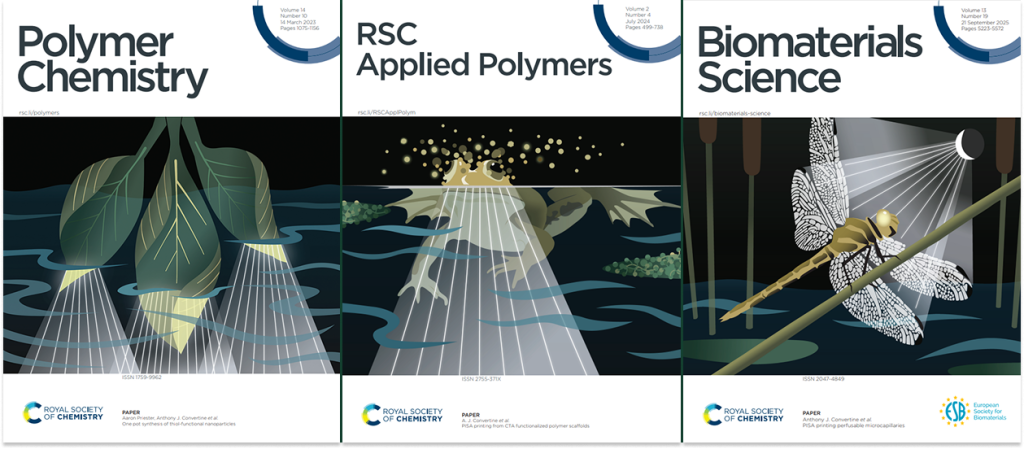Earlier, a 2024 RSC Applied Polymers cover article highlighted how modifying the liquid resin with additional chain-transfer agent groups improves printing efficiency and produces stiffer, highly crosslinked materials. The 2023 Polymer Chemistry cover introduced a resin that employs polymerization-induced self-assembly, creating nanostructured networks during light-based printing and supporting tissue scaffold applications.