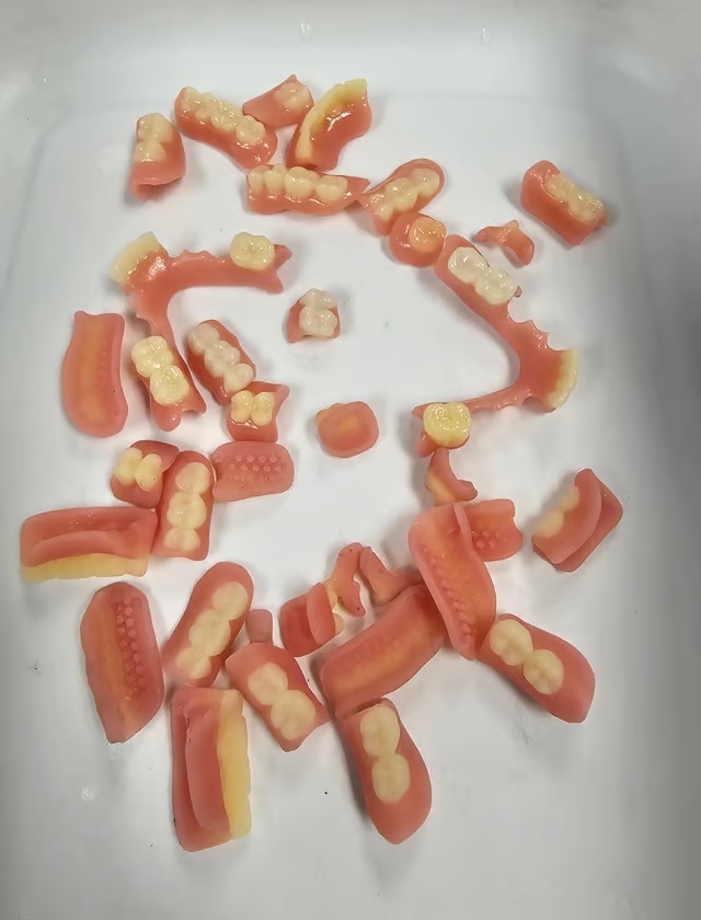Simultaneously, the removable partial dentures are printed on the NextDent 300, a multi-material 3D printer officially launched by 3D Systems in summer 2025. The FDA-cleared platform is unique in that it can print monolithic dentures, with realistic teeth and gums printed as a single part. The system, which has a build volume of 295 x 211 x 50 mm, can print about 15 dentures at a time using a combination of different FDA-approved materials, including NextDent Jet Base LT, NextDent Jet Teeth White, NextDent Jet Teeth Yellow and Wax support material.