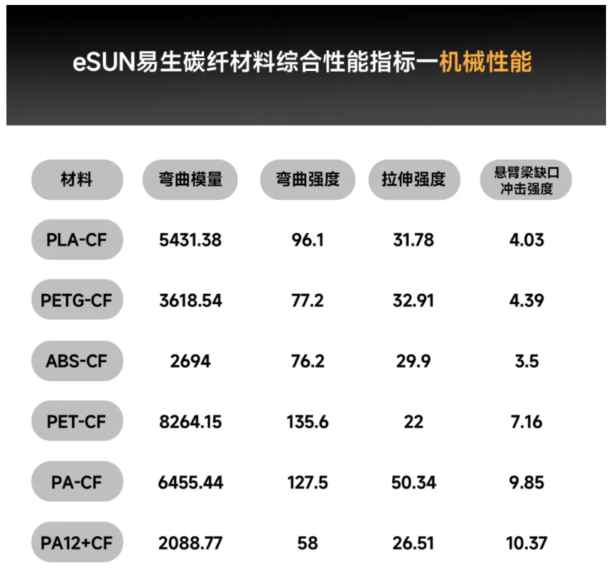 In addition to common PLA and PETG, eSUN offers a series of carbon fiber reinforced 3D printing materials including PET-CF, ABS-CF, PA-CF, and PA12+CF.