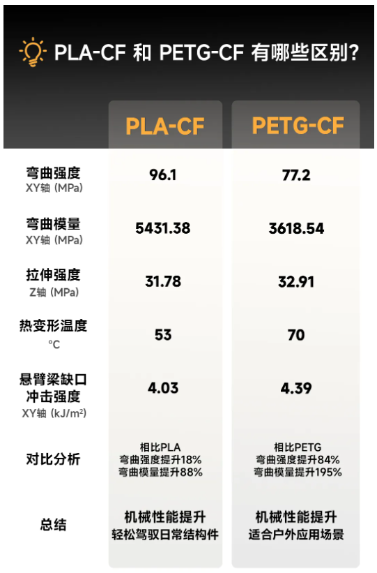 Leveraging PETG's weather resistance characteristics, PETG-CF has broader applicability and can be used outdoors or in humid environments.