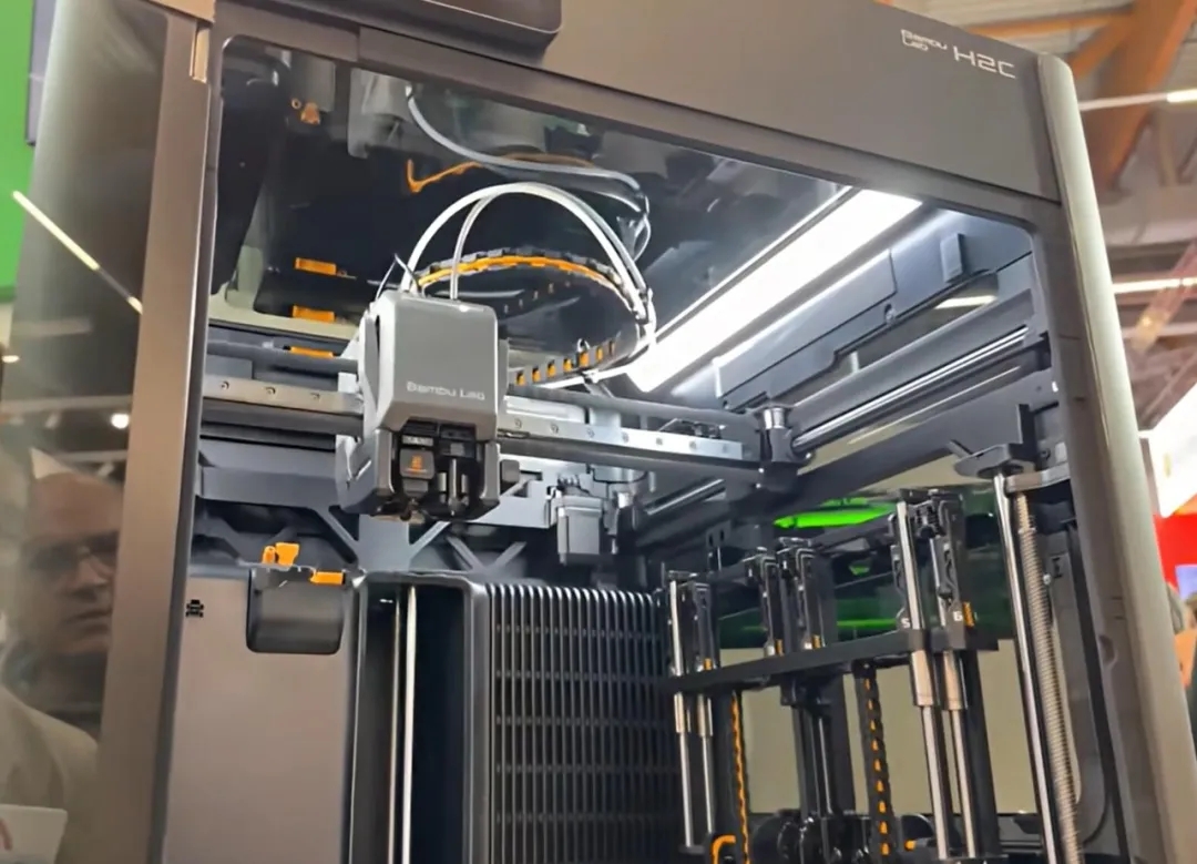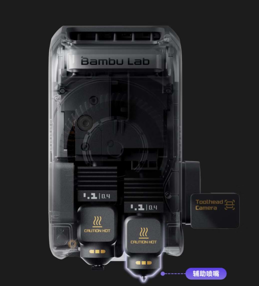 ② Bambu Lab’s own Vortec multi‑hotend switching technology: 7 hotends that can be switched, applied in models such as the H2C. This technology is technically challenging and has not yet been adopted by other companies. By automatically and quickly physically swapping entire pre‑heated hotend modules to switch materials, rather than purging through a single nozzle, this fully wireless design combined with induction heating technology not only achieves rapid pre‑heating in 8 seconds but also completely solves the industry‑wide problem of large amounts of “purge waste” in traditional multi‑color printing, making the printing of colorful models or composite materials more efficient and cleaner than ever before.