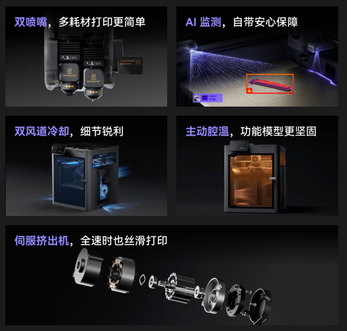 Dual‑head, dual‑nozzle system: Side‑by‑side retractable structure with integrated filament break detection, cleaning, and calibration. Switching is clean, with no oozing, no stringing, and minimal color cross‑contamination.