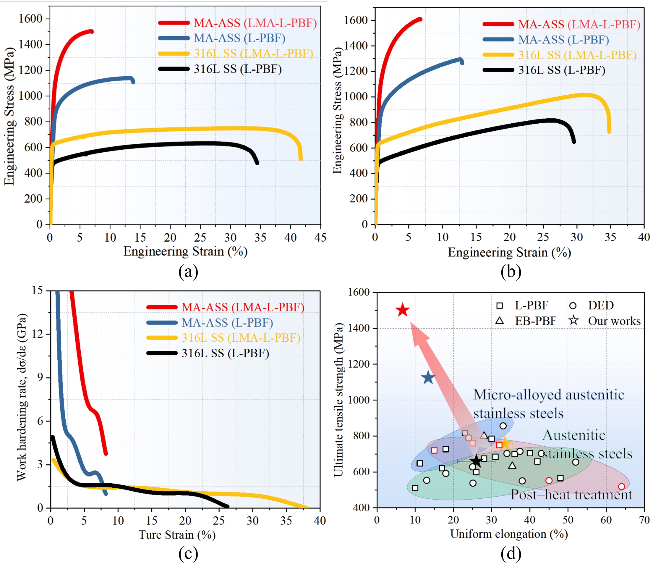 Fig. 5 (a) Tensile engineering stress-strain curves of MA-ASS compared with 316L stainless steel; (b) True stress-strain curves of specimens prepared by Laser Powder Bed Fusion (L-PBF) and Liquid Metal-Assisted Laser Powder Bed Fusion (LMA-LPBF) processes, respectively; (c) Corresponding strain hardening rate vs. true strain relationships; (d) Summary comparison of ultimate tensile strength and uniform elongation for additively manufactured 316L stainless steel, including data from this study, Laser Powder Bed Fusion (L-PBF), Directed Energy Deposition (DED), and Electron Beam Powder Bed Fusion (EB-PBF) processes.
