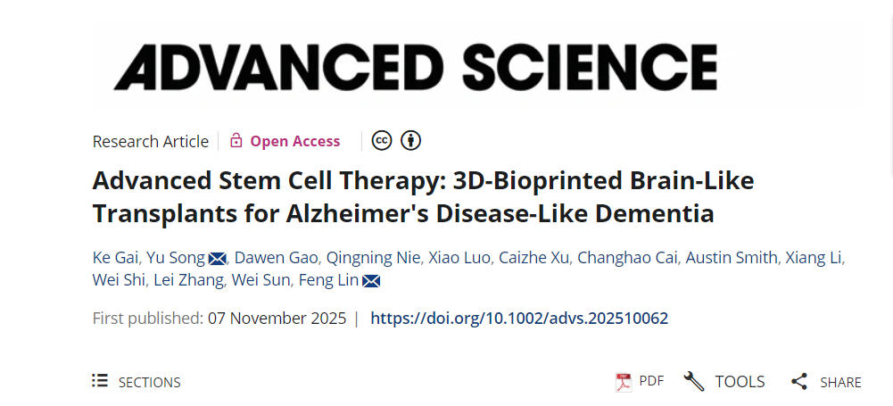 The research findings, titled "Advanced Stem Cell Therapy: 3D-Bioprinted Brain-Like Transplants for Alzheimer's Disease-Like Dementia," were published in the November 2025 issue of Advanced Science. The first author of the paper is Ph.D. student Gai Ke from the Department of Mechanical Engineering, and the corresponding authors are Assistant Researcher Song Yu and Professor Lin Feng from the same department. The research was supported by the National Natural Science Foundation of China and the National Key Research and Development Program of China.