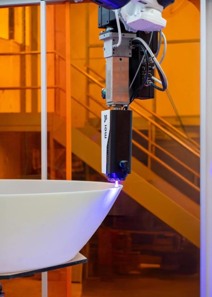 In this case, the cup was fabricated by Moi Composites using its Hybrid Fabrication Platform with Short Fiber Manufacturing technology for UV-activated deposition of short-fiber–reinforced vinyl-ester resins. Moi Composite’s SFM-based HFP system is a complete setup that includes a 6-axis industrial robot in a production area measuring 6 x 4 x 3.8 meters. At the end of the robotic arm is Moi Composites’ proprietary S18 toolhead, capable of depositing printing bead widths of 4-8 mm and enabling high-throughput deposition of short-fiber-reinforced thermoset composites. These short fibers are fed directly into the toolhead from an external reservoir.
